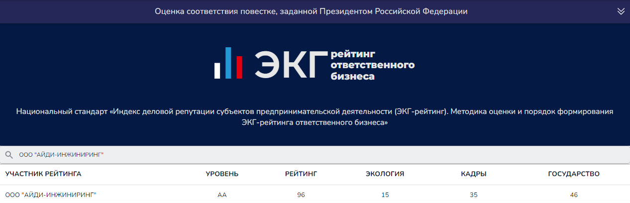 ООО "АЙДИ-ИНЖИНИРИНГ" в рамках ЭКГ-рейтинга получило продвинутый уровень оценки - «АА». Всего компания набрала 96 баллов из 160 возможных.